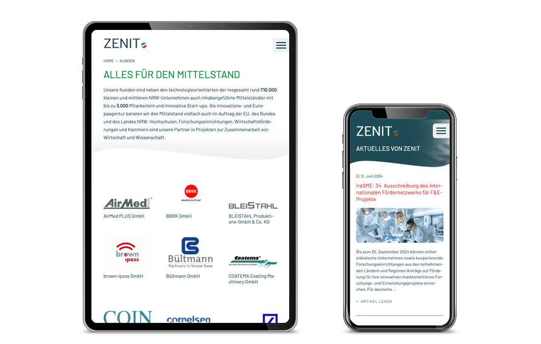 Die Zenit GmbH in Mülheim an der Ruhr bietet Transformations- und Fördermittelberatung für Unternehmen in NRW. Die Themenlage hier ist meist komplex und sehr individuell. Dafür haben wir gemeinsam mit Zenit im Vorfeld eine Nutzerführung und eine Contentstrategie entwickelt, mit dem Ziel, den Besuchern der Webseite eine intuitive Navigation zu ermöglichen. Durch gezielte Call-to-Action-Elemente und eine optimierte Seitenarchitektur wird der Nutzer durch die Webseite geführt und gezielt zu den wichtigsten Informationen und Angeboten geleitet.