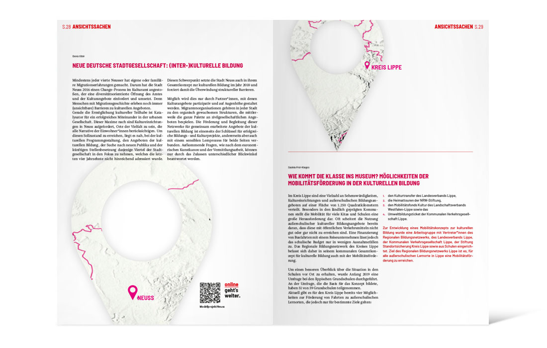 Die Reihe zeigt die Bandbreite an Instrumenten und Maßnahmen, mit denen kulturelle Bildung in der Gemeinde, der Stadt oder im Kreis strategisch entwickelt und umgesetzt werden kann. Der Inhalt wurde gestalterisch von uns aufbereitet und mit Illustrationen, Grafiken und Diagrammen übersichtlich ergänzt.