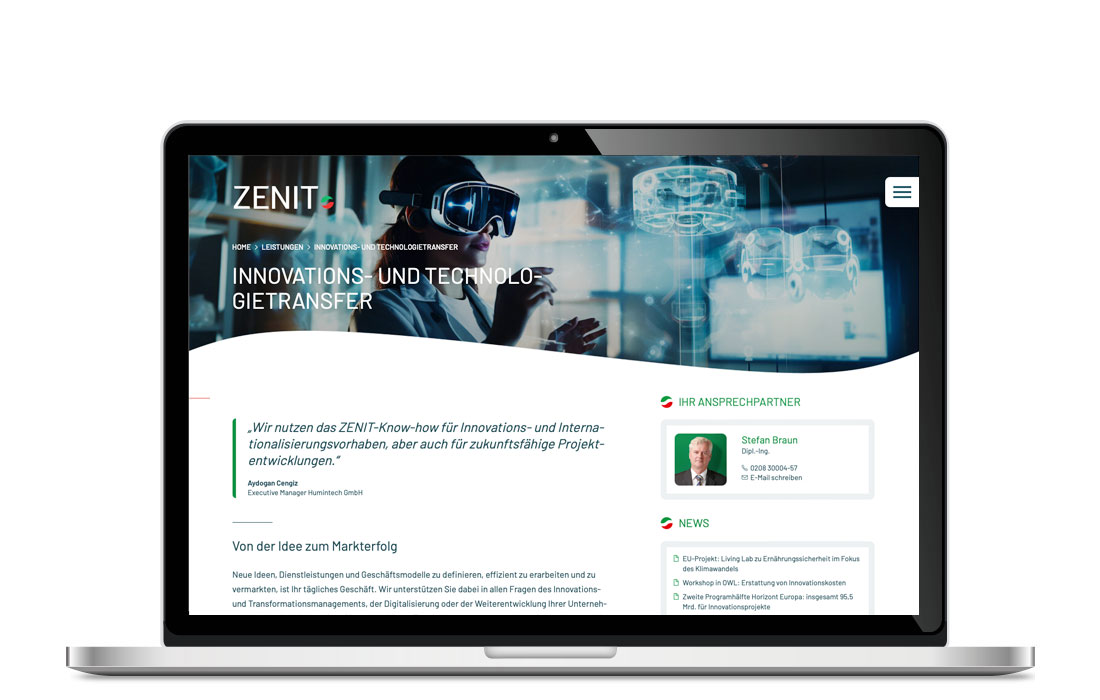 Die Zenit GmbH in Mülheim an der Ruhr bietet Transformations- und Fördermittelberatung für Unternehmen in NRW. Die Themenlage hier ist meist komplex und sehr individuell. Dafür haben wir gemeinsam mit Zenit im Vorfeld eine Nutzerführung und eine Contentstrategie entwickelt, mit dem Ziel, den Besuchern der Webseite eine intuitive Navigation zu ermöglichen. Durch gezielte Call-to-Action-Elemente und eine optimierte Seitenarchitektur wird der Nutzer durch die Webseite geführt und gezielt zu den wichtigsten Informationen und Angeboten geleitet.